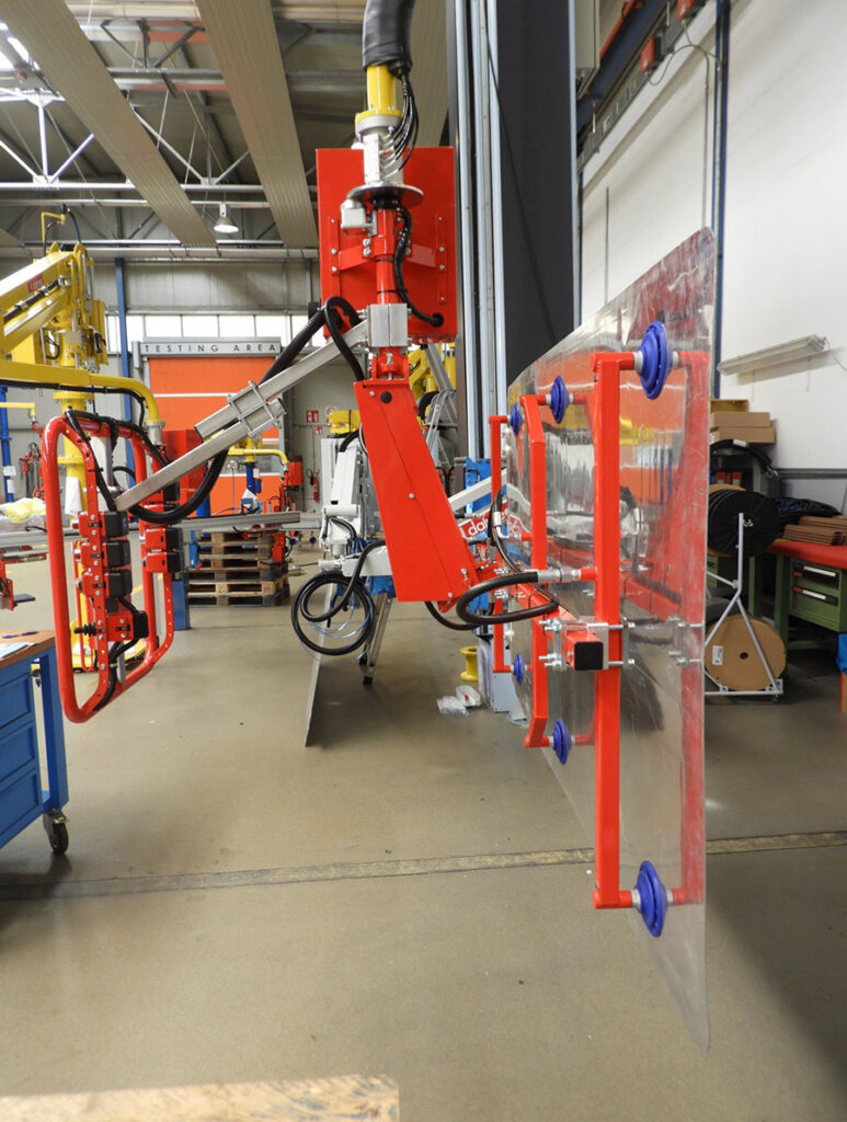 Every model is supplied with custom tooling designed around the specific product being handled, from suction cups for sheet glass and cartons to mechanical grippers for drums, pails, and structural components.