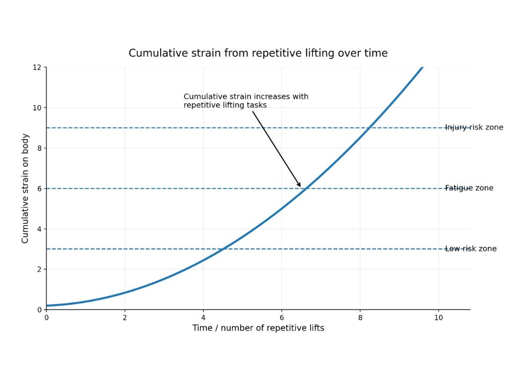 A 10kg carton lifted once is a trivial task. A 10kg carton lifted 400 times in a shift is 400 repetitions of spinal loading, shoulder rotation, and grip force. Even if every lift is technically within limits, the cumulative exposure becomes significant over time.